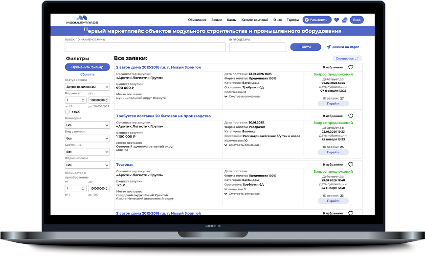 Торговая площадка для поиска, покупки и аренды модульных конструкций. Также у нас можно найти исполнителей для проектирования, производства и монтажа модульных объектов. Общество с ограниченной ответственностью «Модуль-трейд», ОГРН 1254700005119